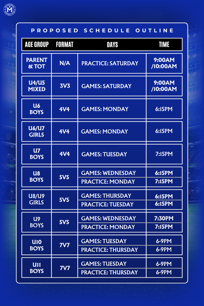 Please note that MMFC reserves the right to change days of play, start times and/or to combine age groups at any time